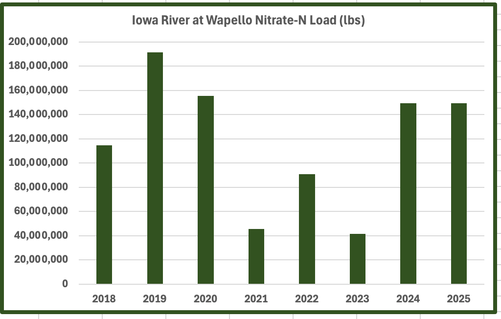 First, some notes on the data. The nitrate data are from the USGS sensor at Wapello and the Iowa DNR ambient monitoring station. I also used river discharge data from the USGS station. The precipitation data are from the Iowa Environmental Mesonet at Iowa State. Yearly data is shown as water years (Oct 1-Sep 30). Thus the 2025 water year ran from 10/1/24 to 9/30/25. The period examined is 2018-2025 for the simple reason that I had data for this site conveniently aggregated on my computer from my past work managing the Iowa Water Quality Information System sensor network. The intention here is not to illustrate or comment on any long-term trends.