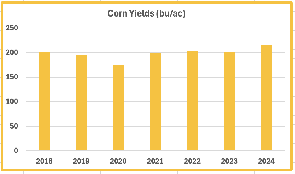 Now let’s look at corn yields for the five climate zones draining to the watershed (2025 not available yet).