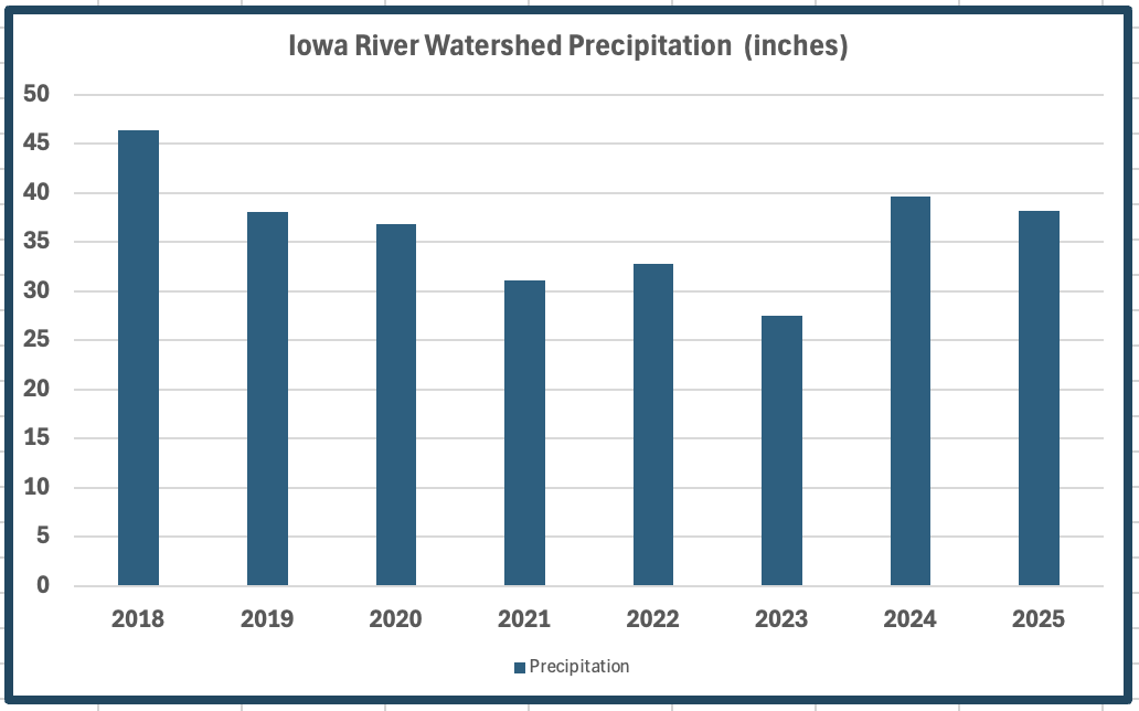 A general rule of thumb for the eastern half of Iowa is annual precipitation below 30”is dry and above 40” is wet. We can see there were two such years—2018 (wet) and 2023 (dry). But note that the range of values here is much smaller than for N loading, with values varying only be a factor of 1.7. Remember that number for the N loading was 4.6.