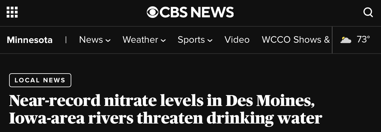 In a press conference, Central Iowa Water Works Executive Director Tami Madsen stated water below 10 mg/L nitrate, the current standard, ‘is safe to drink.’ This is a dubious claim at best, as research dating back 25 years shows nitrate above 3 mg/L associated with a variety of negative health consequences including cancer and birth defects. If you live in Polk County, you only rarely drink water below 3 mg/L nitrate.