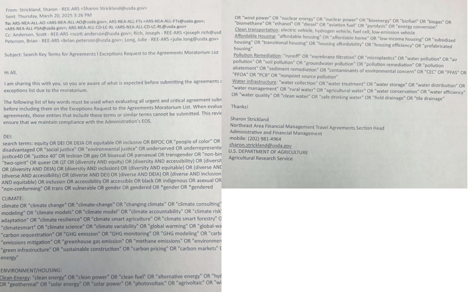 ARS was in the news Sunday because a leaked USDA memo included an exhaustive list of banned words that must be searched when evaluating ARS agreements with other entities. This includes all the usual DEI, race, gender, and sexual suspects but also dozens of words related to weather, climate, water and environment in general. Making the list: