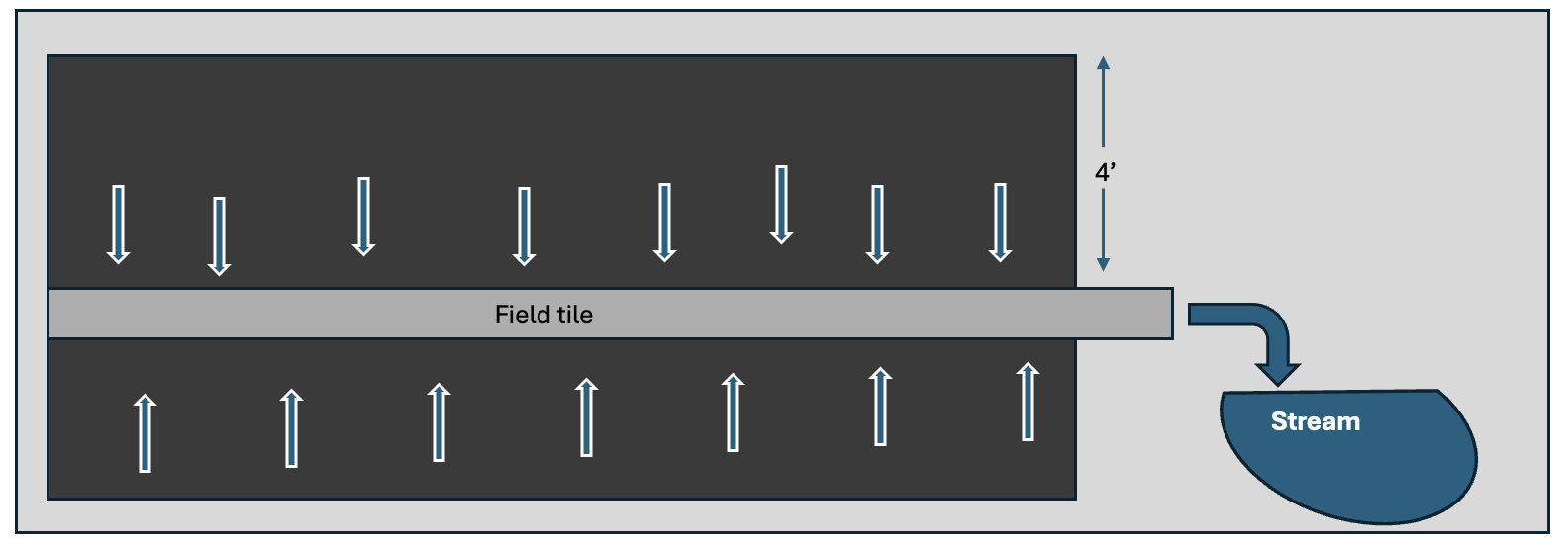 Warm weather has prevented deep frost. A large portion of stream nitrate is sourced back to agricultural field tiles (pipes) which lower the water table in tiled fields. Common practice is to install tiles to a depth of 4’. Frost below that depth freezes up flow of water to the tiles and by extension interrupts that source of nitrate. Deep frost prevents flow of water to the tiles from both above (water table aquifer) and below (deeper groundwater migrating upward).