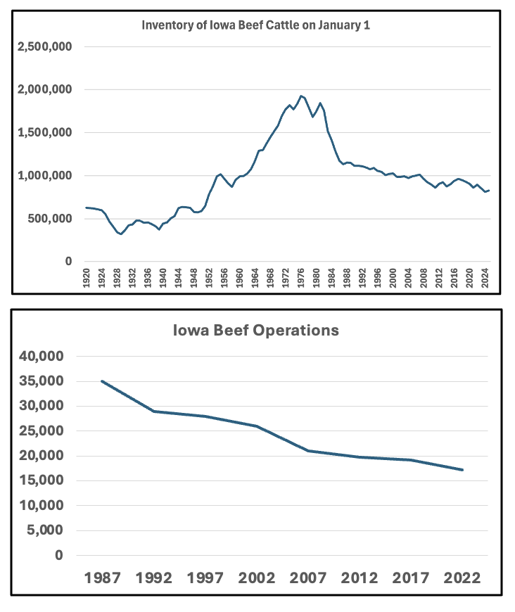 While Iowa’s beef industry has often been in the top 10 nationwide, it peaked in 1976 and in 2024 beef cattle inventories were the lowest since 1952. Only about 3% of U.S. beef cattle now reside in Iowa. Even still, the number of Iowa farmers raising cattle has not dropped nearly as precipitously over the past 25 years as the number of farmers raising hogs, and the size spectrum of beef operations is much more evenly distributed than hogs and laying chickens where the huge operations predominate.