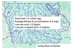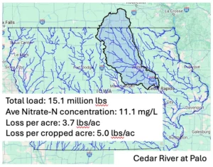 Here are some stream nitrate data for selected watersheds from May 1 until June 2. Nitrate concentration data were obtained from USGS and UI-IIHR. Nitrate loads were calculated using USGS discharge data. Yield (loss per crop acre) was calculated using Iowa DNR land cover database.